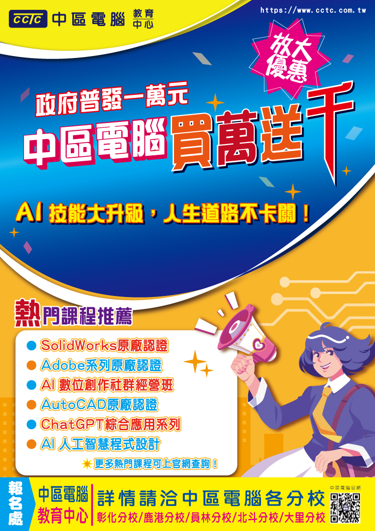 政府普發1萬元 中區電腦買萬送千【不限課程】【活動至12/31截止】